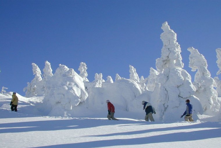 【森吉山阿仁樹冰】樹冰是日本東北地方特有的奇景,來自西伯利亞的寒風夾帶大量水氣,在迎風山坡的松樹上凝結成冰霜,一層又一層地包覆住變成巨大的白色神秘物體,有如深山中的怪物一般,因此樹冰又有雪怪之稱。這種特殊的自然景觀可不是到處都觀賞的到,因此來秋田遊玩一定不能錯過森吉山的阿仁樹冰。搭乘阿仁滑雪場的纜車約 20 分鐘至山頂車站,從阿仁纜車山頂站徒步約5分鐘,可近距離欣賞壯觀的樹冰奇景,馬氏冷杉在酷寒天候下凝結成的樹冰,是銀白世界裡的巨人、雪怪,成群結隊,景象奇異壯麗。