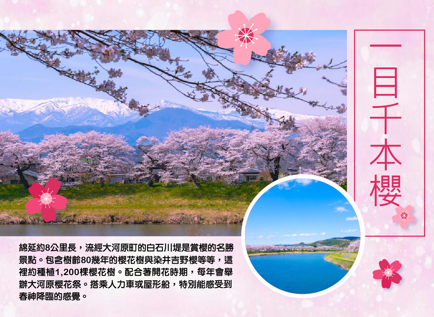 【一目千本櫻】綿延約8公里長,流經大河原町的白石川堤是賞櫻的名勝景點。包含樹齡80幾年的櫻花樹與染井吉野櫻等等,這裡約種植1,200棵櫻花樹。配合著開花時期,每年會舉辦大河原櫻花祭。搭乘人力車或屋形船,特別能感受到春神降臨的感覺。殘雪未融的藏王連峰與近看櫻花綻放出的優美景色,在夜間點燈時的光景格外地奇幻動人。