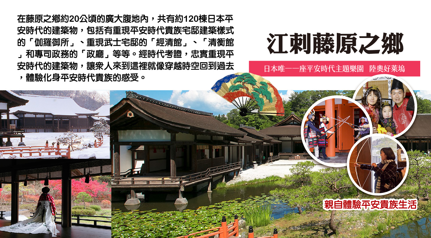 【江刺藤原之鄉歷史主題公園】有日本東北好萊塢之稱的,這個約有20公頃的主題公園,由於重現了120多幢東北地區歷史建築物特有的建築物,如豐田館、寢殿造、無量光院‧柳之御所,以及伽羅御所內的建築物等。進而成為日本的大河劇或是廣告拍攝的舞台。而園區內有著許多能體驗中世紀日本生活的活動項目,今日則帶您前往體驗平安貴族的日常生活,來一趟穿越平安時代之旅。