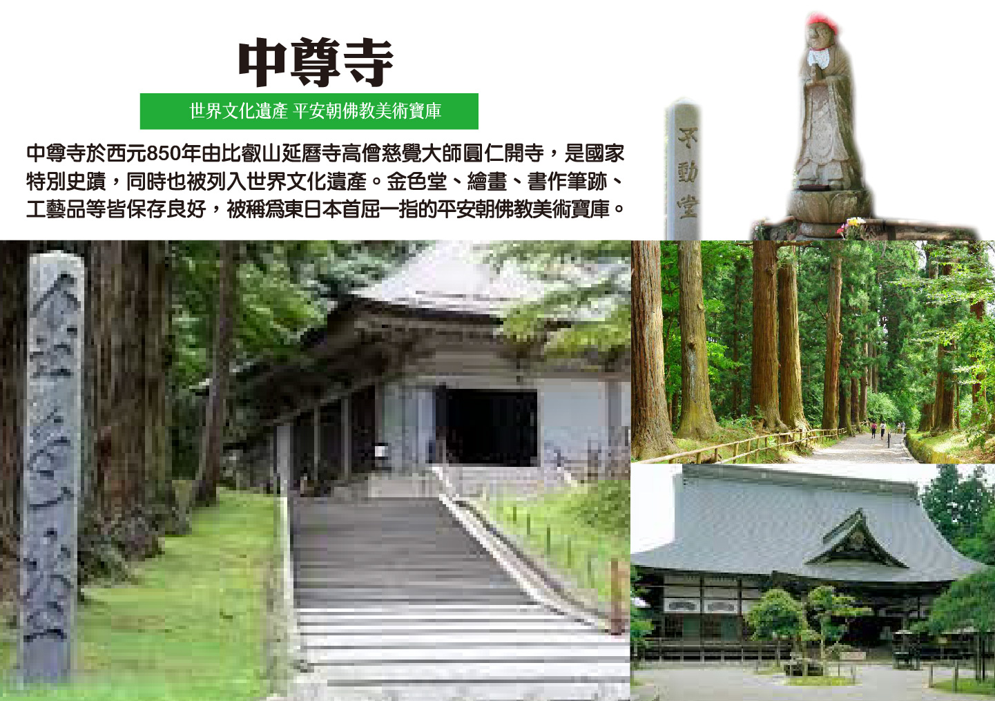 【中尊寺】市內典雅的東北第一大名寺,開創於西元 850年,在1105年由藤原第一代的清衡親手重建;當時的平泉有 21所堂宇和300所以上的佛教設施,是可與京相匹敵的文化都市,在最盛時期約有40個燈塔。