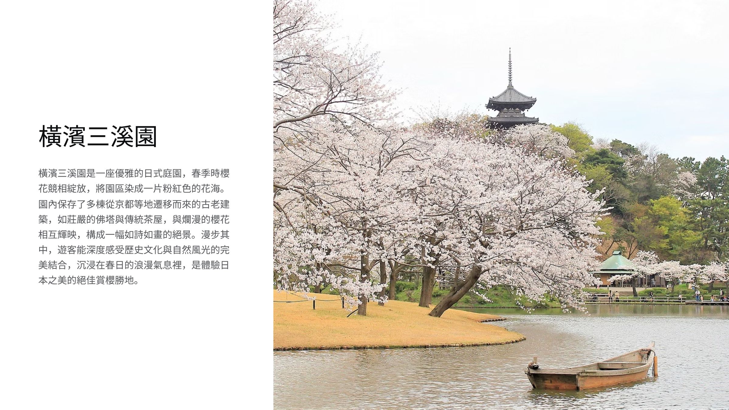 三溪園是橫濱著名的日式庭園,園內保存多座歷史建築,春季櫻花盛開時尤為美麗,是賞櫻的絕佳去處。