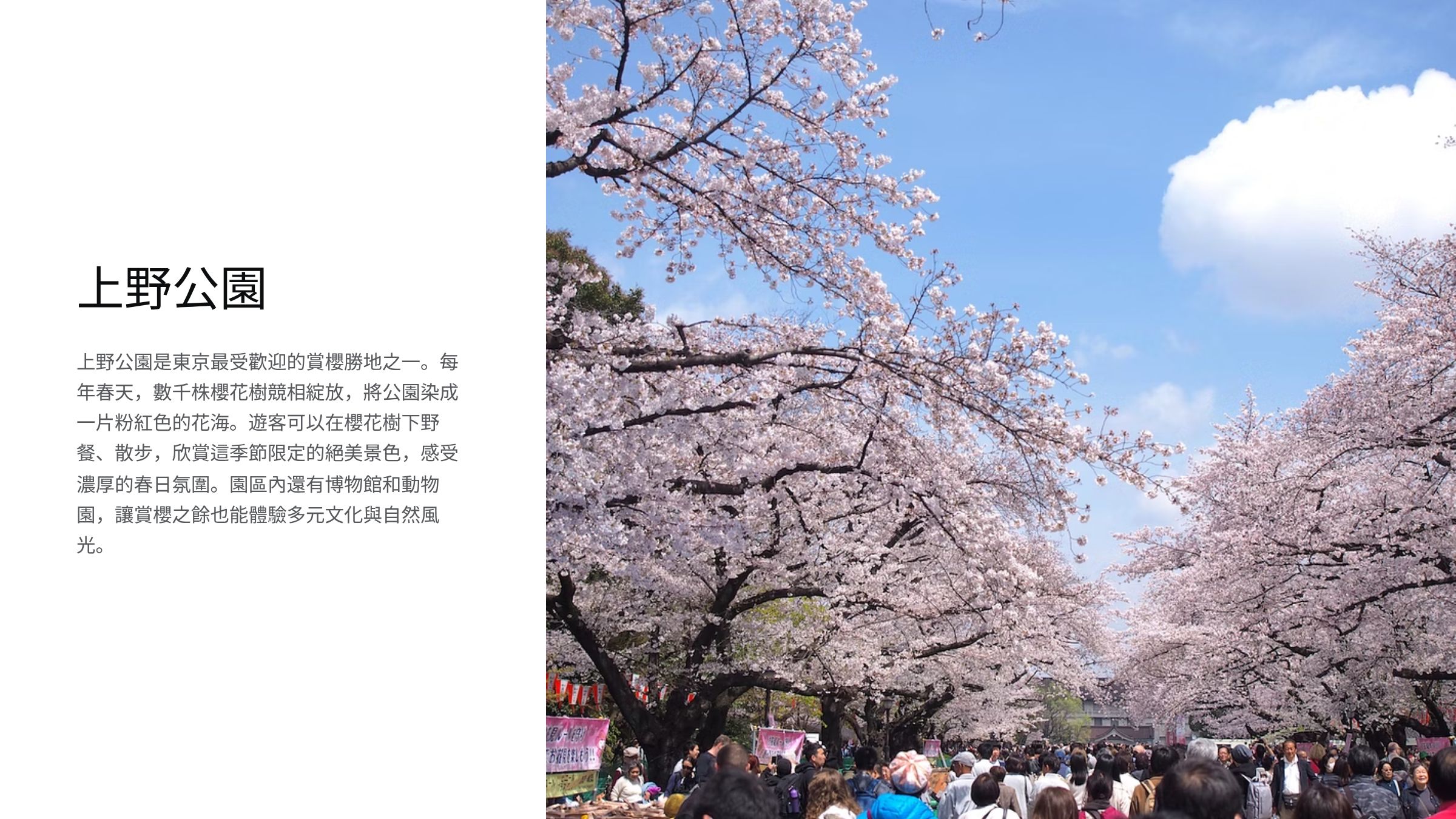 上野公園的中央道路是日本全國知名的櫻花林蔭道。這裡從以前就以賞櫻景點之姿而備受民眾喜愛,俳句詩人松尾芭蕉也曾留下吟詠此地風景的俳句作品。每年3月下旬到4月上旬是櫻花季節,這段期間連日下來會有數十萬人前來賞花,熱鬧非凡。800多株染井吉野櫻盛開齊放的情景相當震懾人心。