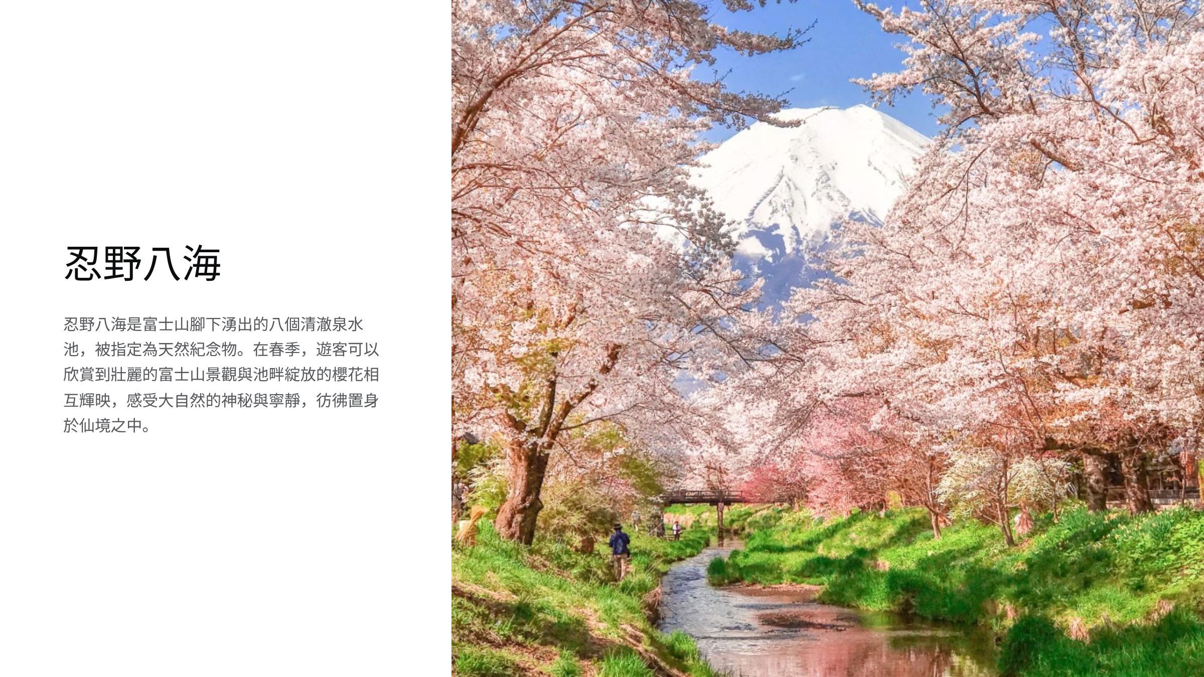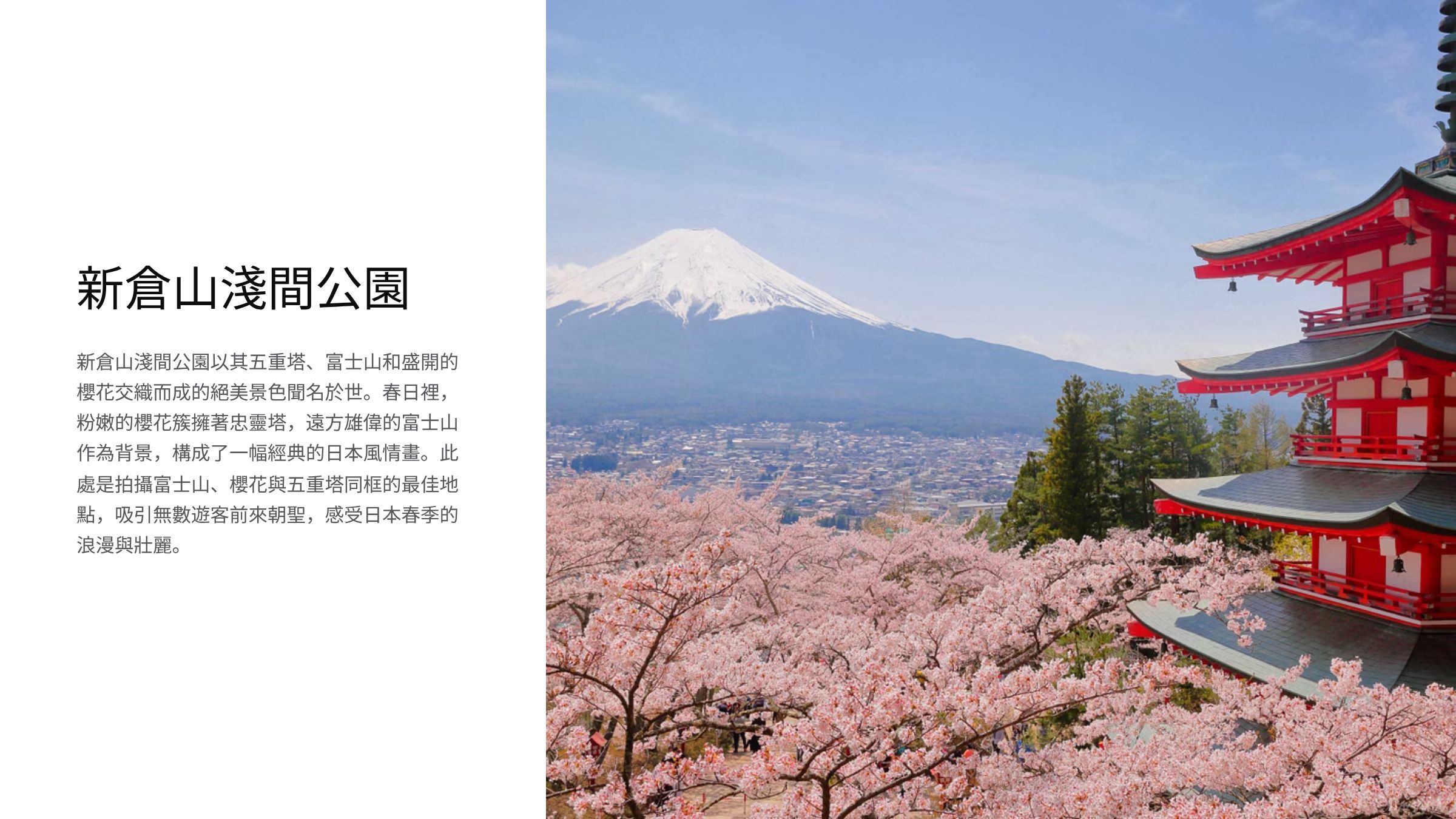 櫻花盛開時節,在日本具代表性的富士山觀景點「新倉山淺間公園(忠靈塔)」舉辦的櫻花祭。可同時欣賞到五重塔與富士山的美景,來自日本國內外的遊客絡繹不絕。園內種有650株櫻花樹,每當櫻花綻放,便可一次盡覽被視為日本象徵的櫻花、富士山和五重塔共築的絶美景緻。