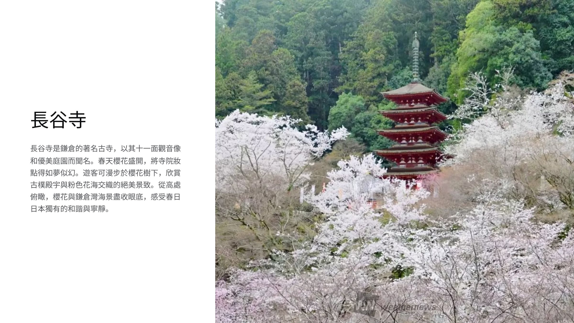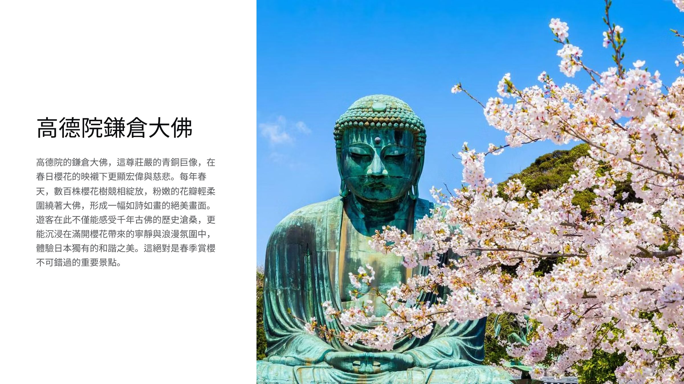 鎌倉大佛是日本著名的古蹟,高約13.35公尺的青銅佛像,與櫻花相映成趣,是春季必訪景點。